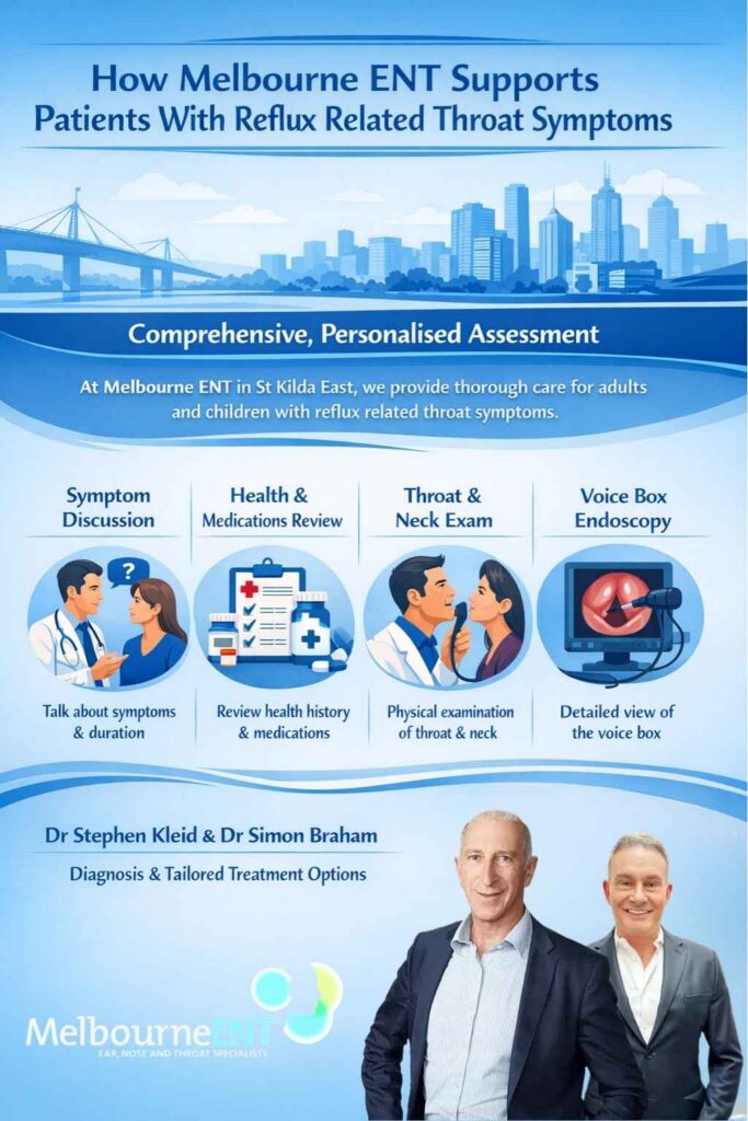 To learn more about silent reflux, throat symptoms and the services available at Melbourne ENT in St Kilda East, you can contact the clinic or visit related pages on this website