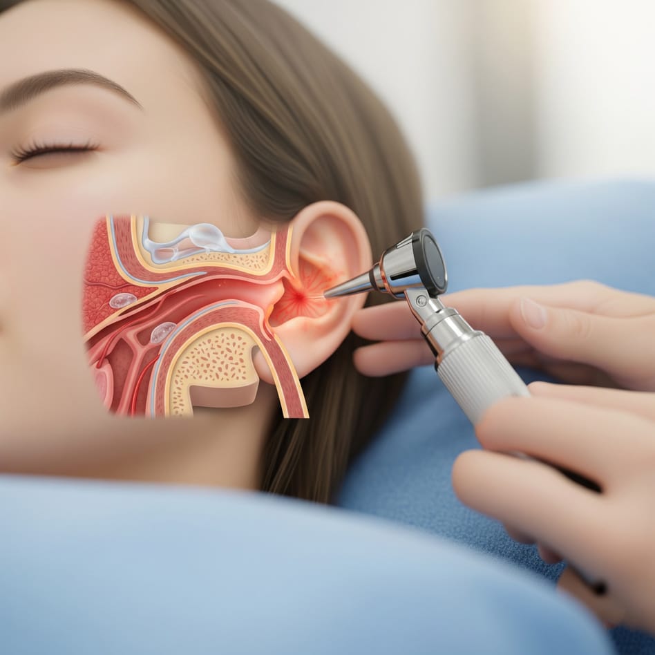 Fluid in the ear or “otitis media with effusion” (OME) means an abnormal accumulation of fluids in the middle ear, behind your eardrum, affecting the function of your eustachian tube. The eustachian tube is a narrow passage connecting your throat to your middle ear.